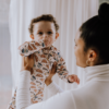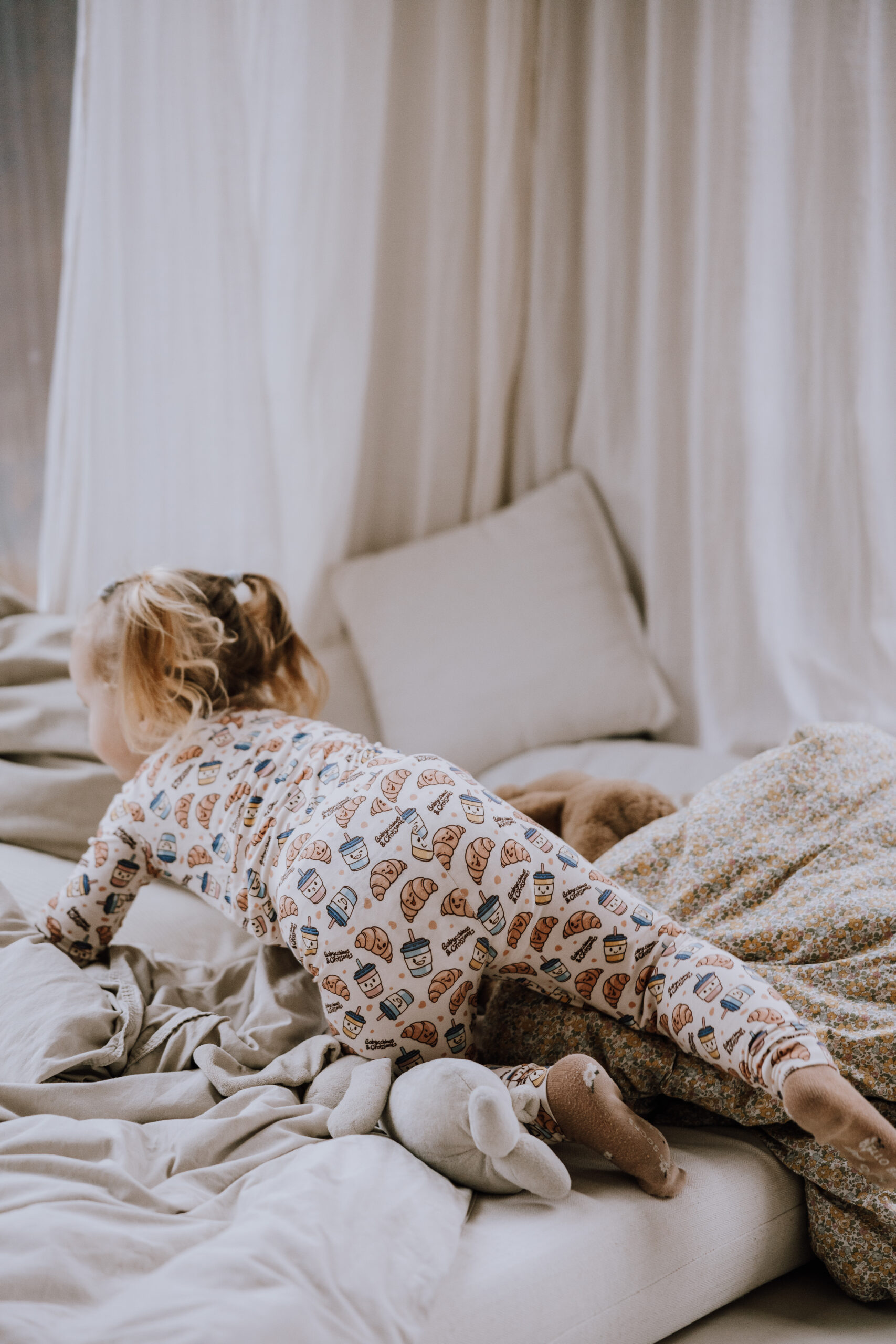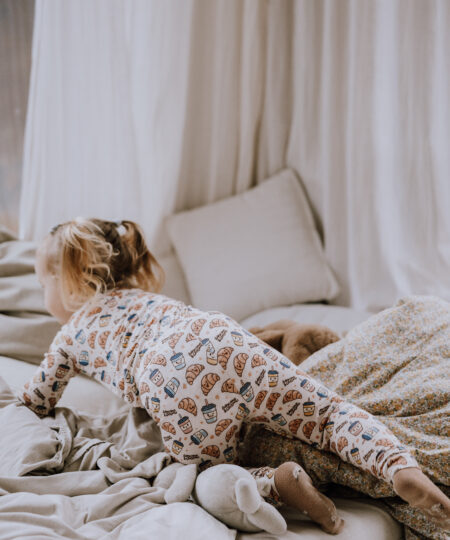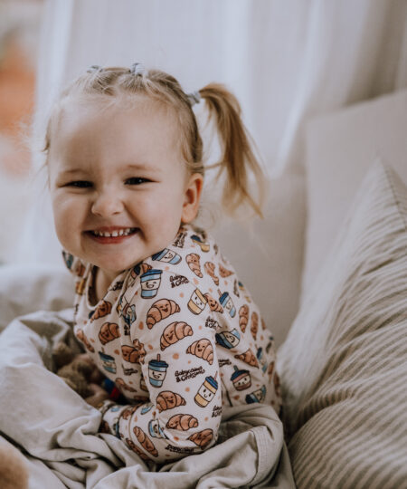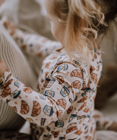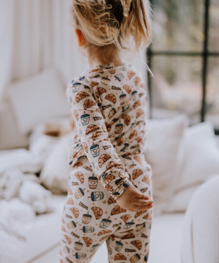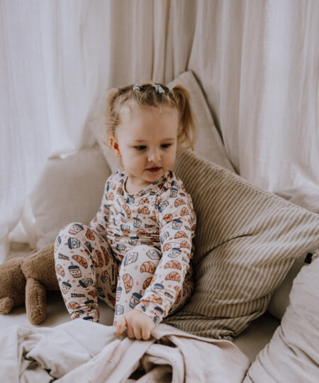 Forkæl din tumling med søde drømme i vores to-delte pyjamassæt. Dette “Babycchinos & Croissants”-print er målrettet de lidt større børn og er vores moderne fortolkning af den klassiske “Milk & Cookies”. Dette er vores lille twist på de mange barsels-kaffe-dates, din lille stjerne formentlig har deltaget i. Printet er i kønsneutrale og rolige farver.