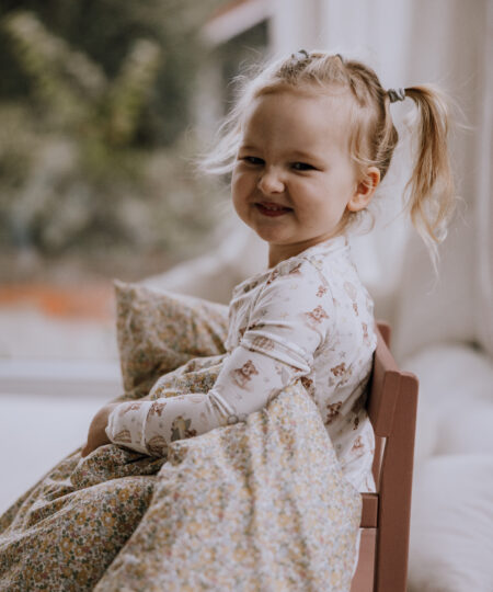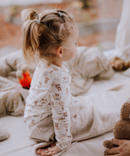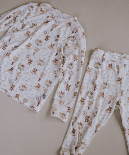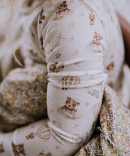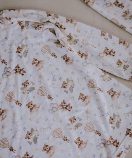 “Bears & Balloons” er et af vores klassiske, kønsneutrale prints. Den søde bamse svæver mod drømmeland i sin flyver, luftballon eller på en lille sky – præcis som de fleste af os gjorde som børn. Et roligt, fantasifuldt univers, der gør puttetid lidt mere magisk.